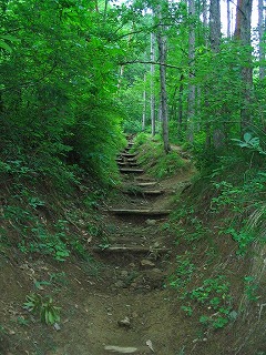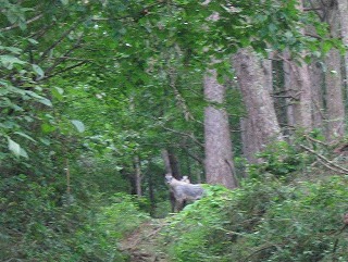 登り始めて1時間弱。 突然、わたし達がゆく道の行く先に、かもしかの親子が 出現! じっと、こちらを観察し、逃げる様子はない。 母親らしきかもしかが林の中へ消え、 子供は興味深げにこちらを何度も振り返り、 やがて、見えなくなった。 |
