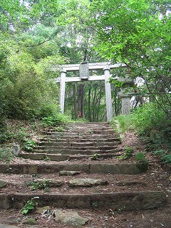 太郎山の山頂の少し下に、太郎神社がある。 山頂への登山道は、つまり、昔の参拝道だったようだ。 距離の標識「二十丁」などと書かれた小さな祠が、 山頂へと導いている。 ←これは参拝道の入り口鳥居。 |