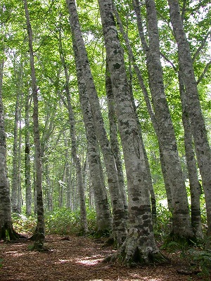 カヤノ平のブナ林と ニッコウキスゲの群生を見に出かけました。 あんまり知られていないキャンプ場には 10組に満たない家族連れなど。 静かで涼しくて景色も良くて・・・ ちょっとした穴場だと思います。 ロッジの脇の歩道からブナ林の中へ。 様々のブナがずーっと続いている。 木肌はつるつるとしていて、根元は苔むしていました。 |