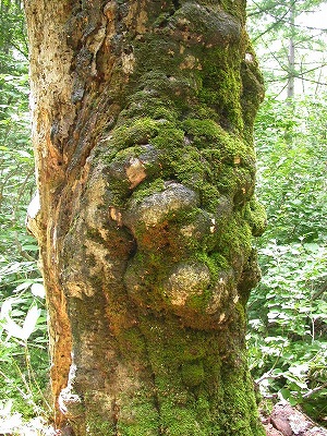 立ち枯れたのか折れたのか… 地上4〜5mほどで切れていた ブナの幹。 表面はごつごつしていました。 ←このコブは人の顔にも見える・・・・? |