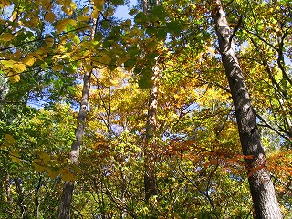 紅葉が見頃だった。 黄緑〜黄色〜オレンジ〜赤〜茶色・・・ 空が真っ青だったので、 そのコントラストが本当に綺麗でした。 視界が開けると山全体が赤かったりして 登山者は皆「うわぁ〜」と思わず声をあげていました。 眼下、戸隠高原の風景、遠く菅平方面の山々も綺麗。 |