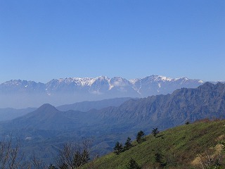 視界が開けると・・・ 白馬連峰がくっきりと見えた。 雪が積もっている!! わくわくしてきた。 唐松岳、鑓が岳、杓子岳、白馬岳、小蓮華岳。 手前の△山は一夜山。そこから右の方が戸隠連峰。 |