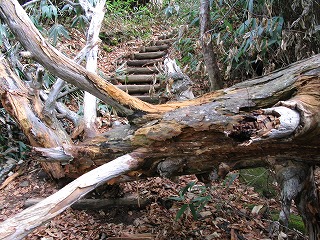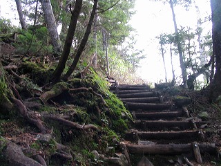 アライタ沢を過ぎた辺りから登りが始まる。 中間地点までは、木の階段で整備されている。 道のうち8割は階段。 どっちかというと、普通の山道の方がいいなあ・・・ 自分の歩幅で歩けないから(笑) |