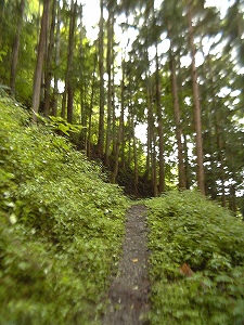 | 下りは早い。 前日に雨が降ったらしく足元が滑る。しかし軽快に下る。 途中小川を渡るが、その静かな水辺にはサンショウウオが。水がすごく綺麗ってこと! |