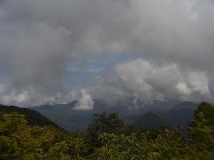 | ハイペースのため1時間弱で山頂到着! 見晴らしはいいものの、山々には雲がかかっていて、稜線を眺めることは出来なかった。 →写真:山頂から戸隠連邦を見て。(雲だらけ…) |