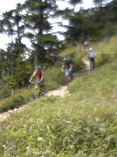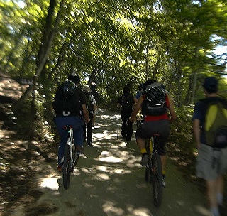 | 大菩薩峠を経由しての下山。 峠へ続く道を、MTBの二人がかけおりてゆく。結構な岩・石の細道を問題なく下れてしまうMTBってすごい。 |
