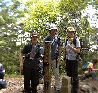 | 軽快に歩を進めて(二日酔にやられてしまっている人約2名以外・笑)大菩薩嶺へ到着。 →Photo: カマン山岳部3名 少し広くなった山頂は木々が多く見晴らしはきかないので、景色の良い所へ戻った。 |