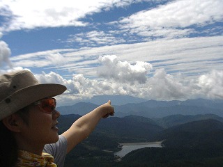 | 指さした方向に富士山がドーンと見えるはずだったが・・・ 雲だらけ。 1時間ほど昼寝などして待ってみたけれど、雲が晴れる様子はなく、断念して下山することに。 |