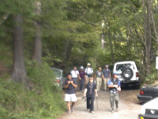 | 今回は地元・ストローハット関係者の品っち&望月さんが案内してくれた。 心配された天気の方は暑いくらいの晴れ! メンバーのうち2人(ヘロ丸&J)はMTBを担ぎ山道を行く。 →はじめはコンクリートの道を茶屋まで行く。 時々、大菩薩嶺の頂上付近が木々の間に見え隠れする。立ち木が少ないようだ。 |