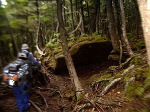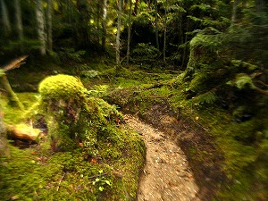 | 霧がかかりもやっとした感じもいい。 しらびそ小屋に向かいなだらかな林道を ショートカットしながら行く。 湿度が高く、 モイスチャー、肌もしっとり! 苔むしている。 |