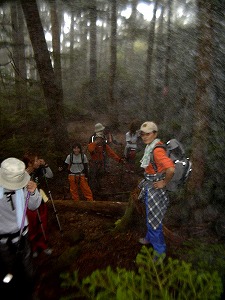 | ミスト感あふれる森の中を、ゆっくりと進む。 中山峠直前はやはり急登。 休み休み進む。 →Photo:本日の面々。 |