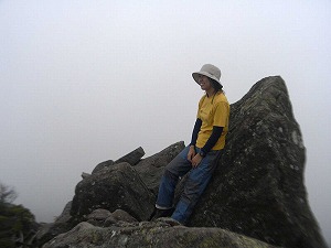 | Photo: {にゅう}てっぺんの岩によりかかって。 (けっこうな高さがありました) 空は曇りガスで視界は開けていなかったけれど、 にゅうの岩から見下ろした下界は なかなかの絶景。 |