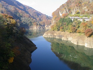 | 長野駅を出発し、406号線を鬼無里・白馬方面へ向かう。 朝の9時を過ぎてはいたが、戸隠の山並みにはまだ 朝もやの気配が残っていた。 途中のビュー・ポイント{裾花ダム}→ 水面に紅葉の山がくっきりとうつる! |