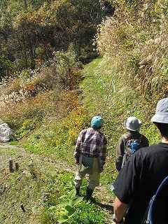 清水さんの案内で登山口へ向かう。 →→→ 先頭を行くのが清水さん。 正面に伸びる小道が 登山道入り口。 |