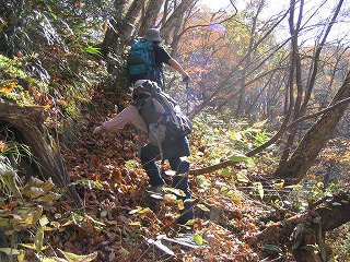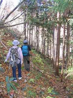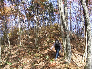 | 登山口とは分からない小道を入ると、踏み跡の区別もつきにくい山道、 笹と落ち葉を掻き分けて進む。 5分ほどで崩落した山肌に突き当たるので、 斜面をよじ登る。 そうすると →→このような林の道に。 しかし、この道は「道なき道」 ほとんど登山者がいないのか、道の見分けがつきにくい。 |