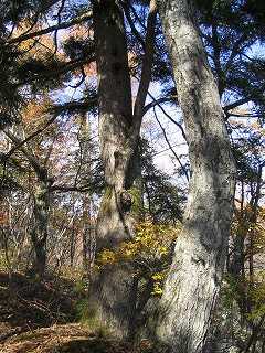 | 尾根を進むと、枝に赤い布の目印がついていて、 大きな松の木が2本生えている ちょっと開けた場所に出た。 ここまでで15分。 まさか頂上ではないよな…と(ガイドブックには1時間かかるとあった) さらに尾根道を進む。 しかし、崖になっていて行き止まり! |