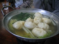 | ▲白骨温泉に入る。 雨で濁流と化した川を目の前に見て、 白色の野天風呂につかる。お肌スベスベ! ▼「あずみの餃子店」の水餃子! スープがたまらない。 |