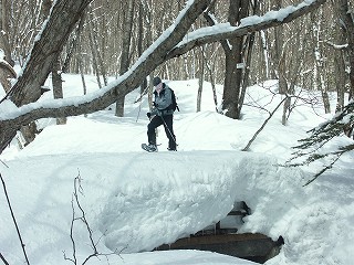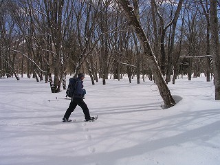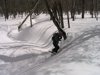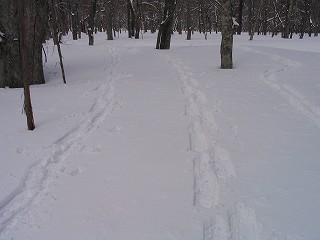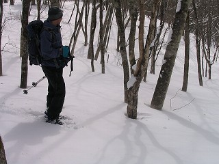 ふきだまりはふかふかです。「ささやきの小径」はどこへやら? 方向だけ定めて林の中をずんずん進む。(J) |