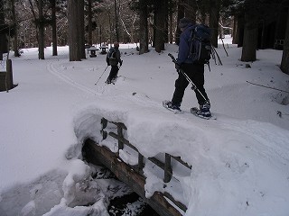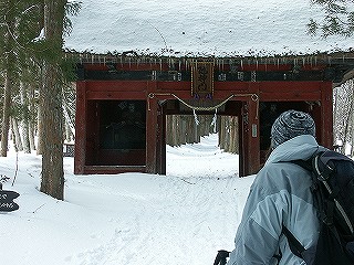 | 最後の橋を渡ると奥社入り口の門へ到着! | 灯篭にも雪が・・・ | 先ほどの台地へ戻ってお昼ご飯! 納豆巻きおいしいです(J) |