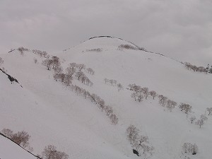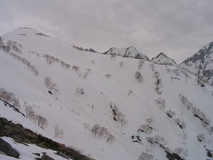 | BC組が滑った斜面。 こうして見ると良さそうなんだけど、 天候・雪質・・・となかなかに厳しい。 |