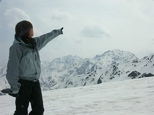 残雪の白馬連峰をバックに撮ったり、ザラメ雪の感触を楽しんだりと