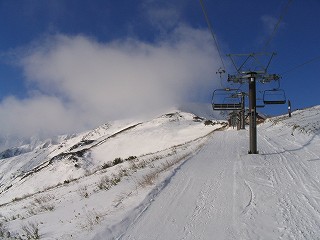 スキー場で滑り、状況が良かったら山にも 登ろうということで装備持参でゴンドラへ。 しかし・・・ゲレンデには雪がない。 回数券で始めから山へ出かけることにする。 下部にはまったく雪がなく さすがにショックでテンションも下がり気味。 |