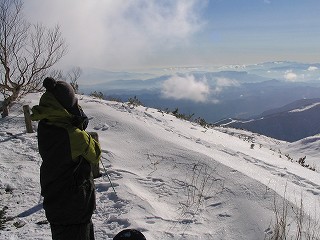 いい天気。 サクサクと順調にハイクアップ。 富士山までよく見えた。 標高をあげても雪は少なめで、 ブッシュや岩が露出。 スノーシューで歩きにくい。 良さそうな斜面を観察しながら高度を上げる。 先行していた林さんが、1本目ドロップした! 軽そうなパウダーがあがり、期待高まる。 |