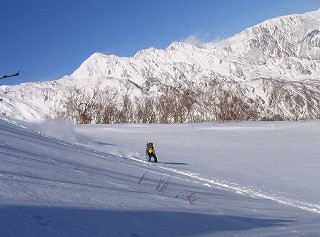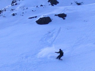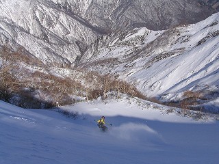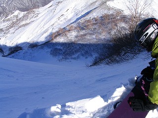 さらに高度を下げ、三本目の斜面。 出だしはスティープです。 ハイクアップ中に見ておいたとこと、 日が当たっていたので、 パックされているとの予想どおり、 下へ行くに従ってかためだったので、 途中で尾根上へトラバース気味に滑り、 登り返した。 |