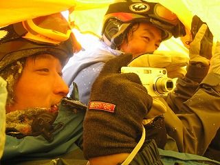 頂上直下までハイクした頃 猛烈なブリザードが襲ってきた。 とても立っていられなく、 その場でうずくまる。 なんとか風の弱い地形の所まで 行き、穴を掘りツェルトを張って 避難。 山の天気の恐ろしさを 思い知らされる。 |