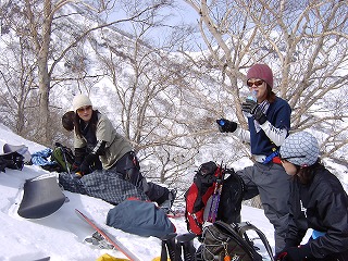ハイクアップ。 クラストした斜面は、 ジグザグに切ると滑落しそう。 キックステップ・・ 意識しながらの直登攀。 Rider:hiropon,ogi,shieno |