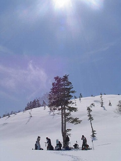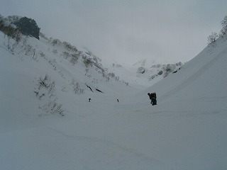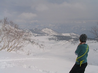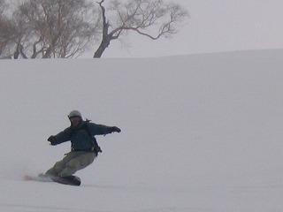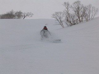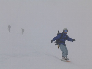 ガスでホワイトアウト。 しばらく晴れ間を待つ・・・ 晴れ間にドロップ。 みんななるべく近くで滑り ゆっくり高度を落とした。 もなか雪に苦労する面々。 Rider:Mizuki |