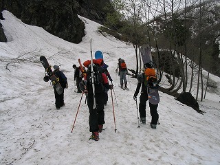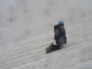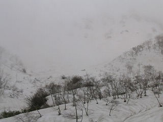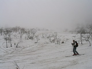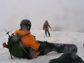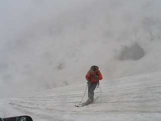 天気悪くガスで何も見えない。 本当なら大きい沢がいくつか 見えてくるはずなのに… Skier:Kazu |