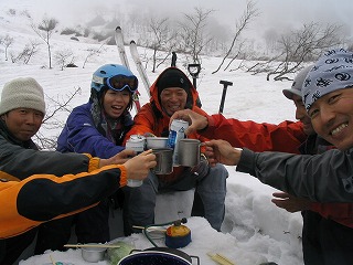 平原にて焼肉! 雪のテーブルを作り、火をおこす! なんと炭火もあり。 まずはBEERで乾杯! |