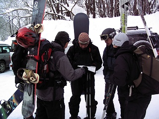8:00出発 初めて {五地蔵山}にアタック。 出発前に地図で確認。 本日のルートは『赤の下』と命名したコースで。 前日にいくつものパーティが五地蔵及び佐渡山方面へ 入ったので、そのトレースを使うことにする。 ラッセル地獄を予想していたので、助かった! |