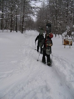 戸隠奥の大橋から林道をつめる。 雪は踏み固められ歩きやすい。 Rider:J、沼田さん |