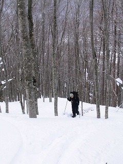 標高をあげていくと、ブナ林が! ブナ大好き!林の中は気持ちいい。 けっこうな急登を細かいジグを切ってシールの跡がある。 Rider:川端さん |