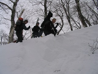 登りルートも模索しながら。 途中でトレースを追ったらm地点にて、 二手に分かれていたので、地図で方向を確認して進む。 そしたら、ちょっとした沢にぶつかってしまった。 トレースもそこを降りて、方向修正をしていたので、 それにならう。 ヘロ丸、佐藤さん、沼田さん |