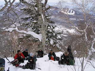 ひとしきり滑りおりた後、次の行く手を眺めて。 川端さん、J、佐藤さん |