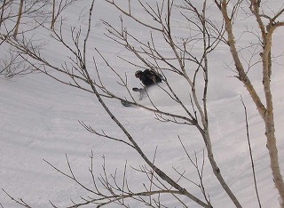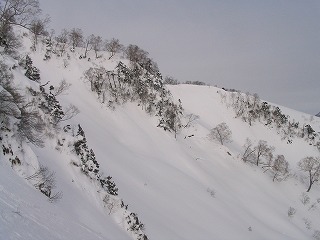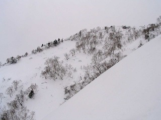 この斜面いいなぁ〜 木の間隔もまばらで斜度もそこそこ。 遠くから見たときは、すごい急に見えたけれど、 そうでもないみたい。滑れるだろうか? |