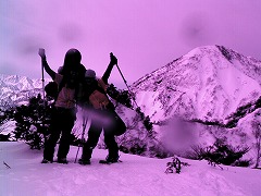 13:00 ドロップ。 山頂でお昼を食べる。 みんな熱心に高妻山の斜面をチェック。 「高妻を滑りたい」って誰もが思ったと思う! CTの結果、 沢筋を少し避け、滑るルートを考えドロップすることに。 Rider:沼田さん@ゲンテン |