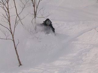 あてこみ地形! しーのーが華麗なあてこみですんごいスプレーを 上げている! 写真撮れず残念! 私もあてこんでみるが、失敗して撃沈。 雪は柔らかくすごくなめらかに板が走り、気持ちいい。 ←こちらは川端さん@お魚 |