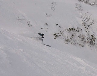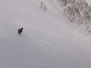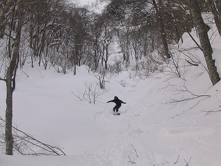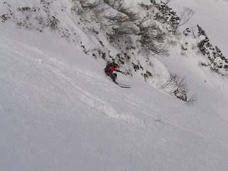 思い思いにのラインで滑り降り、 最後の方はこんな細い沢に。 変化があって面白いが、長い距離に みんな足が疲れ気味?? Rider:しーのー |