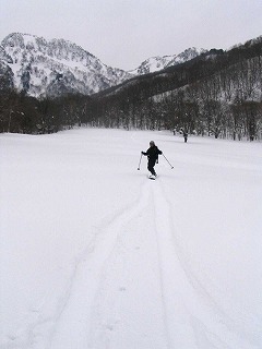 1350m辺りまで滑ると、あとは帰るのみ。 もう少し積雪が増えたら、下部の牧場まで滑れそうだが、 今日はボードには厳しい地形。 シューをはいたりぬいだり、滑れたりラッセルしたり。 先行するスキーヤーを羨ましく思う瞬間。 移動にはやっぱりスキーだなぁ・・・ 最後に牧場へ到着。ほっとする。 片筋ストック(ダブルストック)で横切る。 なんだかこんな風景も面白い。 15:10 下山 登りも滑りも渡渉もルートの探検ももちろん雪も すごく楽しかった1日。 |