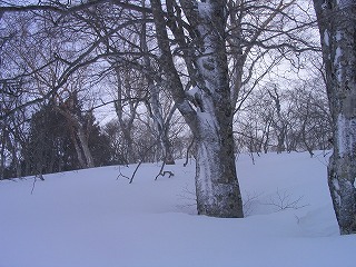 とても太いブナの木がたくさんありました。 雪は軽くてふかふか。 つぼ足でもさくさく進める! |