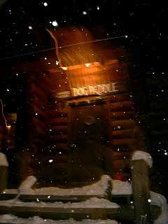 ログハウスの店先で、ハスキー犬のパドルがお出迎え。