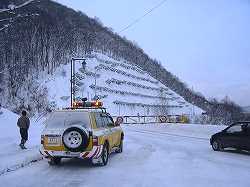 スキー場へ行く道は、閉鎖されていてゲート(→)が開くのは