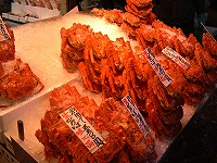 (右)市場で物色する面々 (左)かに!かに!かに! うまそ〜 (買いませんでしたけどね)