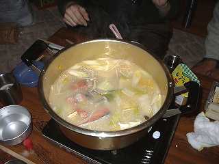 市場で仕入れた鮭他、投入される。味噌仕立て。