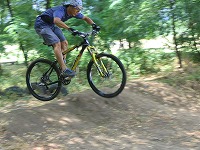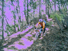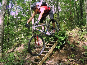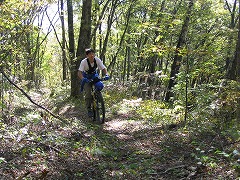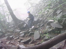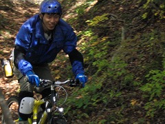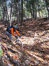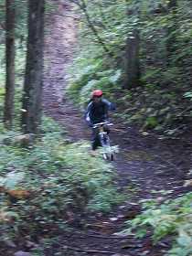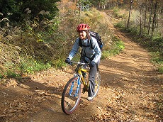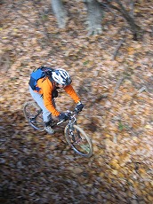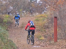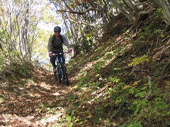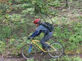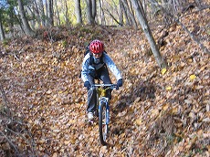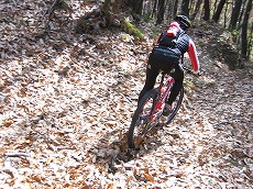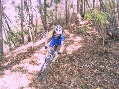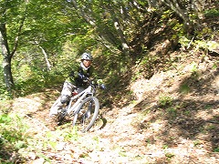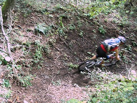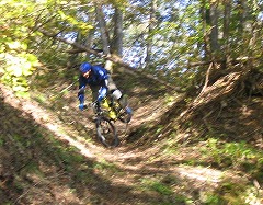 | バンクも。 (J) | 背後に見える私にとっては急坂・・・をクリアした後、 前輪ロックで写真左手の林の中へぶっ飛びました。 その直前画像。 |