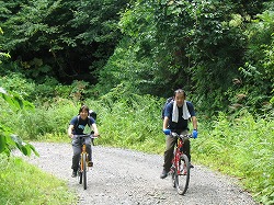 | 頑張って登る (namy) | アップダウンの繰り返し〜な林道。 (J) | 山頂の眺めは最高! かなり気持ち良かったです。 (たけさん&J) |